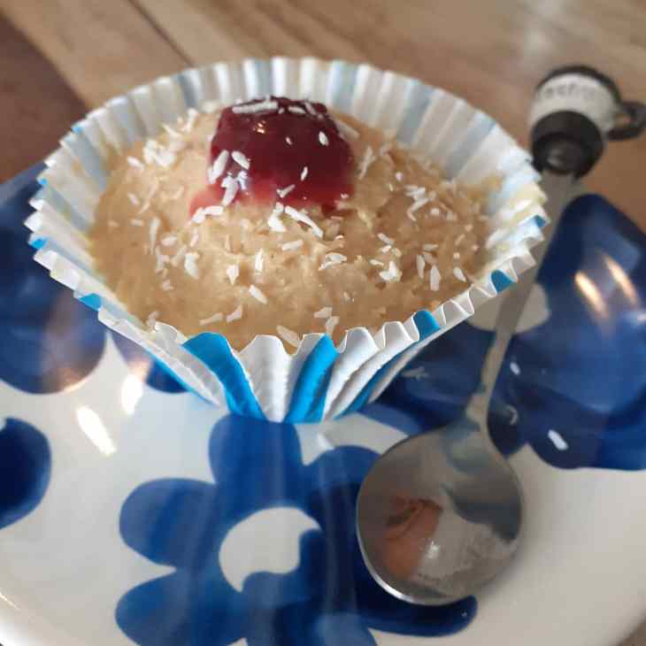 3. Schep het beslag in het muffinvormpje of het schaaltje. Bestrooi eventueel met poedersuiker of doe een lepeltje jam erop.