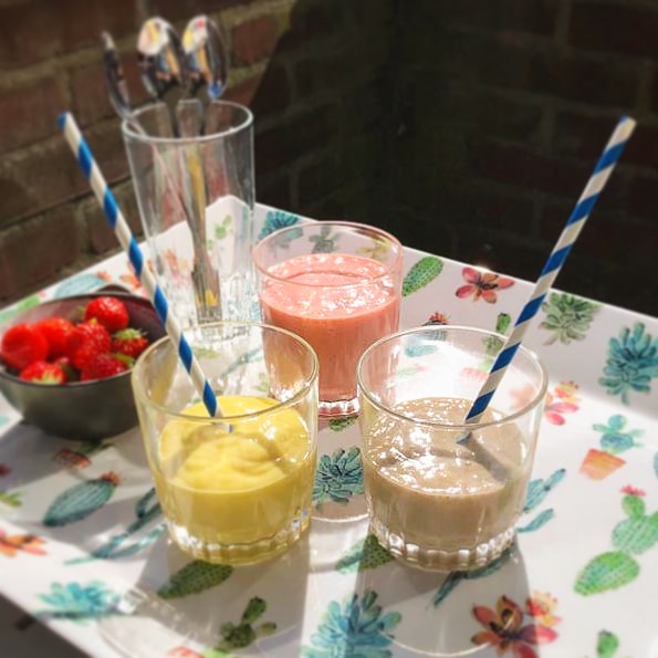 Varieer met lepels jam, kaneel, cacaopoeder door de milkshakes.