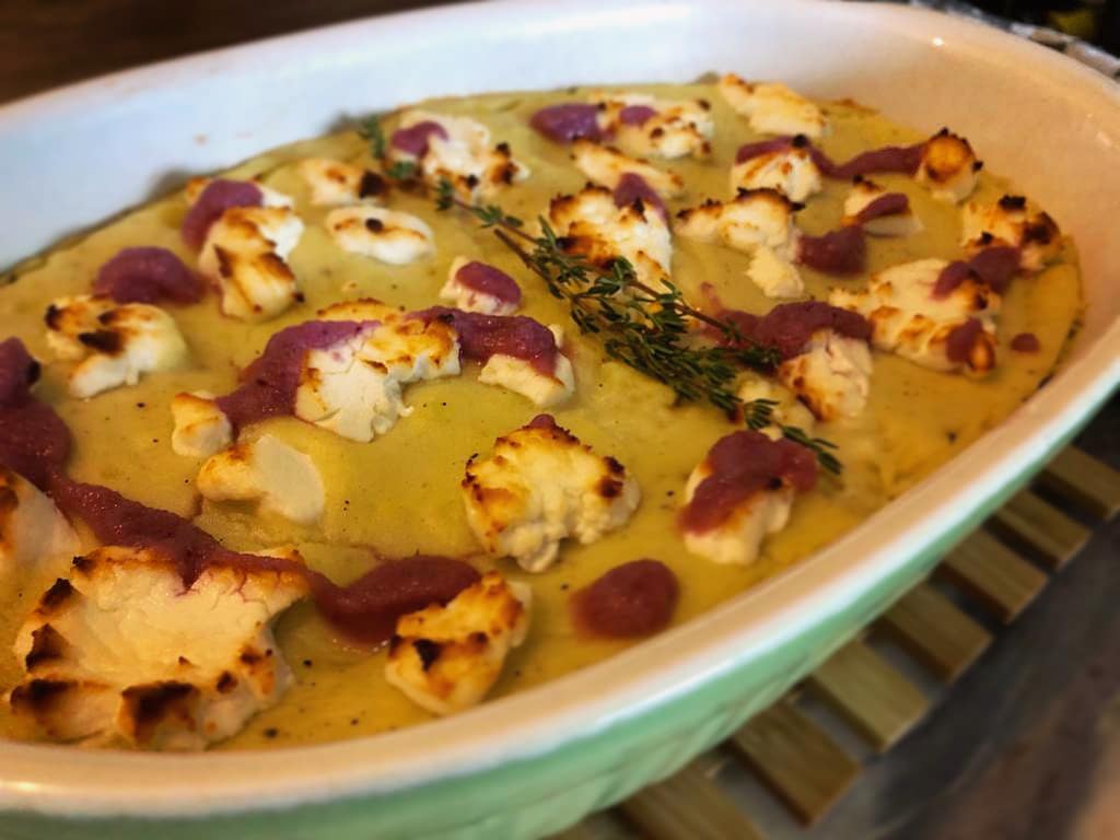 4. Verwarm de oven voor op 180 graden. Vet een ovenschaal in met roomboter. Doe de witlofstamppot in de schaal. Verbrokkel de geitenkaas erboven en zet voor 15 minuten in de oven. Bedek eventueel met aluminiumfolie om ervoor te zorgen dat de geitenkaas niet hard wordt (zoals je op de foto ziet was mijn geitenkaas eigenlijk al iets te hard gebakken).