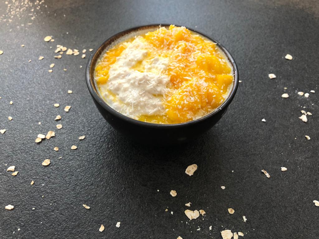 Foto 3: roer geprakte/gepureerde mango en kokossnippers door het basisrecept (ik gebruikte diepvries magoblokjes)