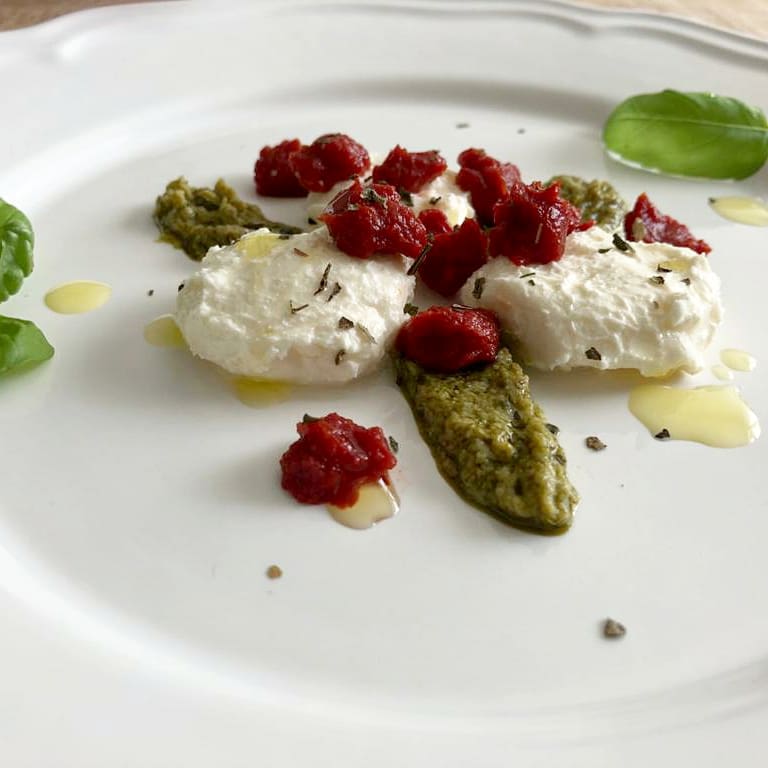 Vorm met je handen bolletjes in de vorm van mozzorella van de mascarpone en leg op een bord. Garneer met de tomatenpuree of tomatenketchup en pesto. Besprenkel eventueel met wat olijfolie.