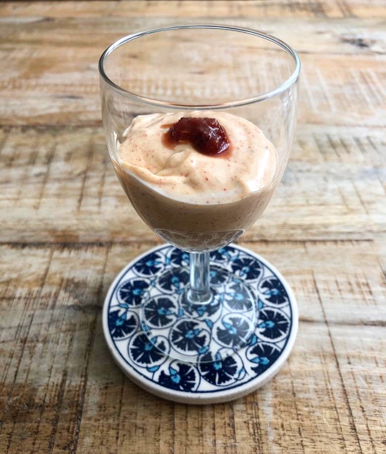 Mix de ingrediënten door elkaar in een schaaltje met een lepel. Het mengsel mag niet aan de lepel blijven plakken wanneer je deze kantelt. Wanneer dit zo is, voeg dan nog een lepel melk toe en mix dit goed. Serveer in een leuk glaasje of schaaltje.