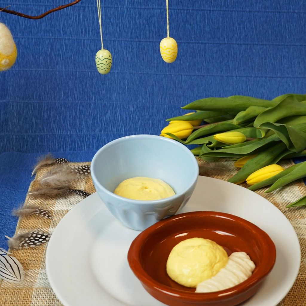 - Pel de eieren en maal deze glad met de mosterd, mayonaise, peper en zout en de kerriepoeder tot IDDSI-4.