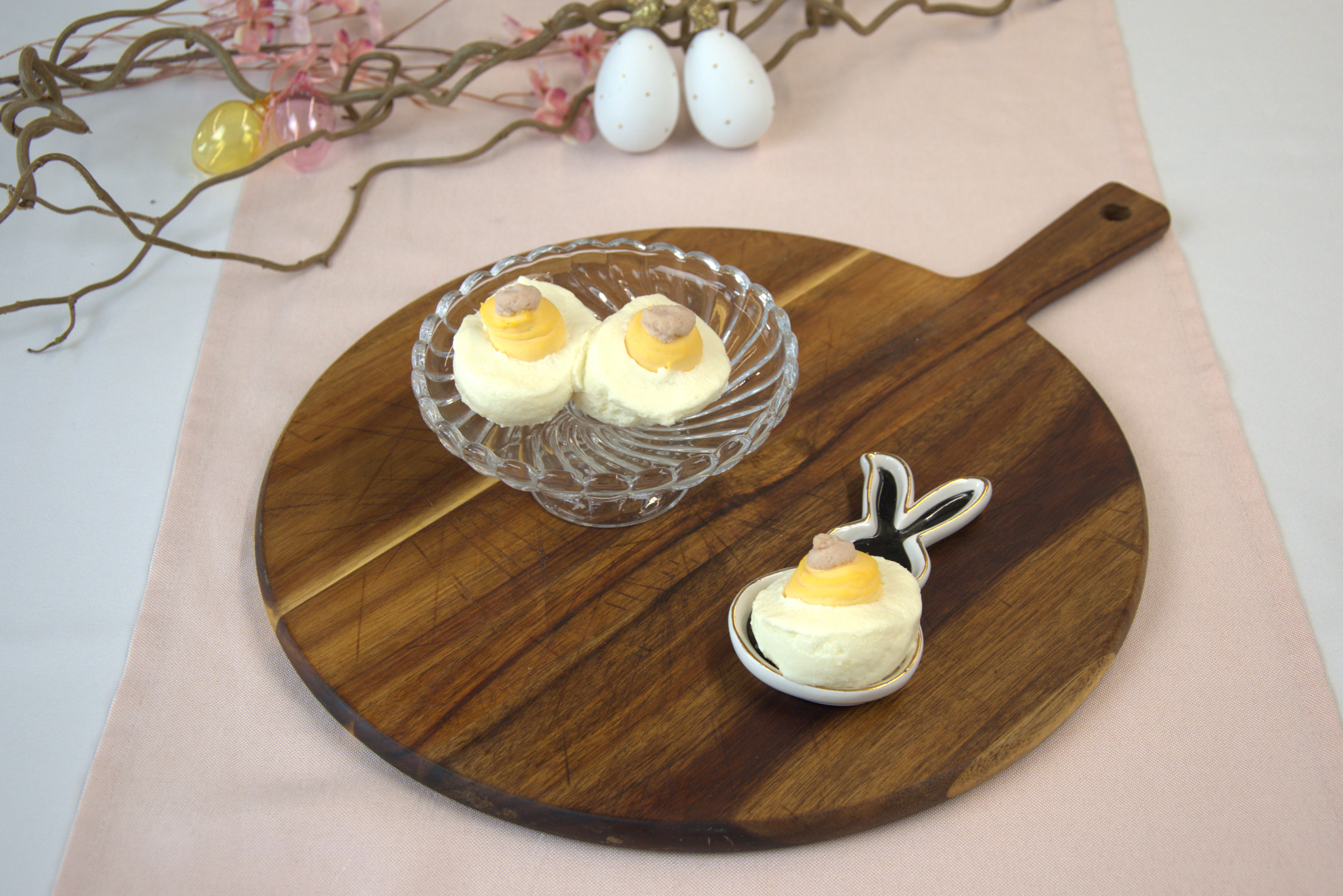 - Haal de eieren uit de vorm en spuit er een toefje hamcrème op. Serveer op een schaaltje, lepel of bordje.